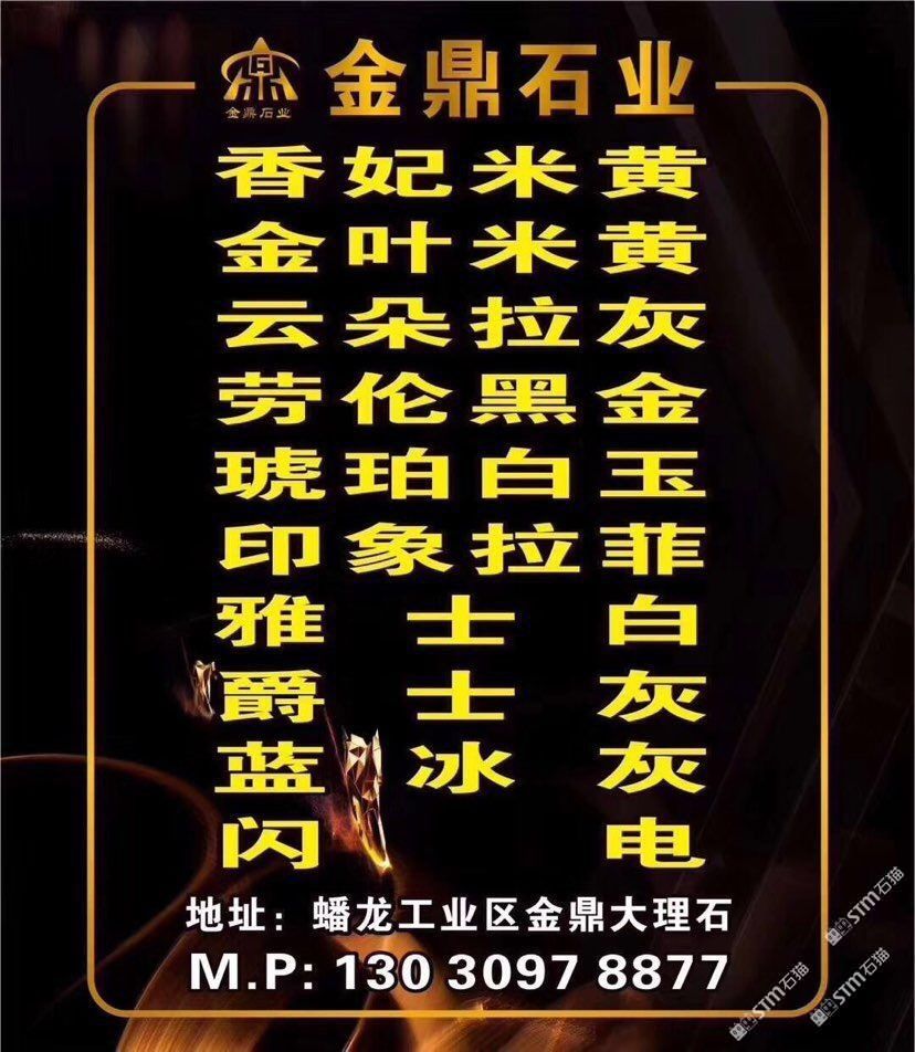 金鼎石業(yè)主營:香妃米黃,金葉,奧特曼,雅士白,云朵拉灰,白玉蘭,閃電灰,奢石,魚肚灰,波斯灰