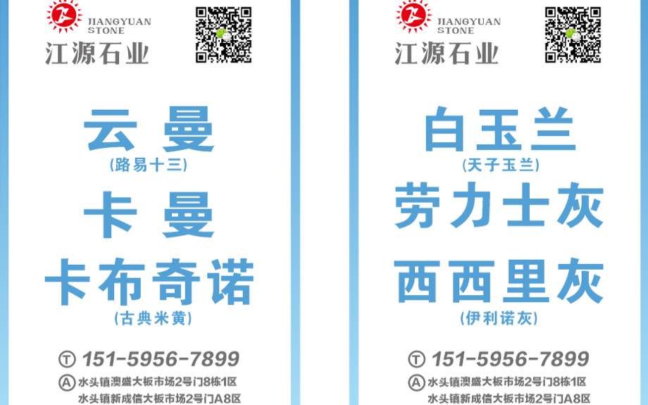 江源石業(yè)主營:白玉蘭、西西里灰、云曼、路易、卡曼、古典米黃(卡布奇諾)、勞力士灰(新月亮谷)、阿里灰(星耀灰)、伊利諾灰、云多拉灰…超大量供應(yīng)精品現(xiàn)貨,任您挑選,趕緊搶購吧! 公司常年大量備貨:大板8萬平方以上! 荒料5000噸以上!常年備有各種厚板1.6公分、1.8公分、2公分、3公分、3.5公分現(xiàn)貨! 銷售點(diǎn):澳盛大板市場2號(hào)門8棟1-4區(qū),新成信2號(hào)門A8-10區(qū),官橋恒升、勝牌大理石廠 聯(lián)系人:呂小姐15159567899 林先生 15959567865