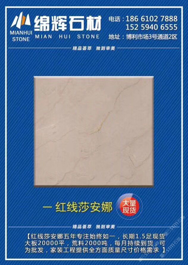 發(fā)布信息: 綿輝石材 主營(yíng):《紅線莎安娜》《美尼斯灰·新古堡灰》 ??長(zhǎng)期現(xiàn)貨兩萬(wàn)平走量不走價(jià),超值特惠90元起?? [發(fā)]另有2600平《金歐典》品種清倉(cāng)揮淚甩賣[發(fā)] 致富熱線:13004819222李