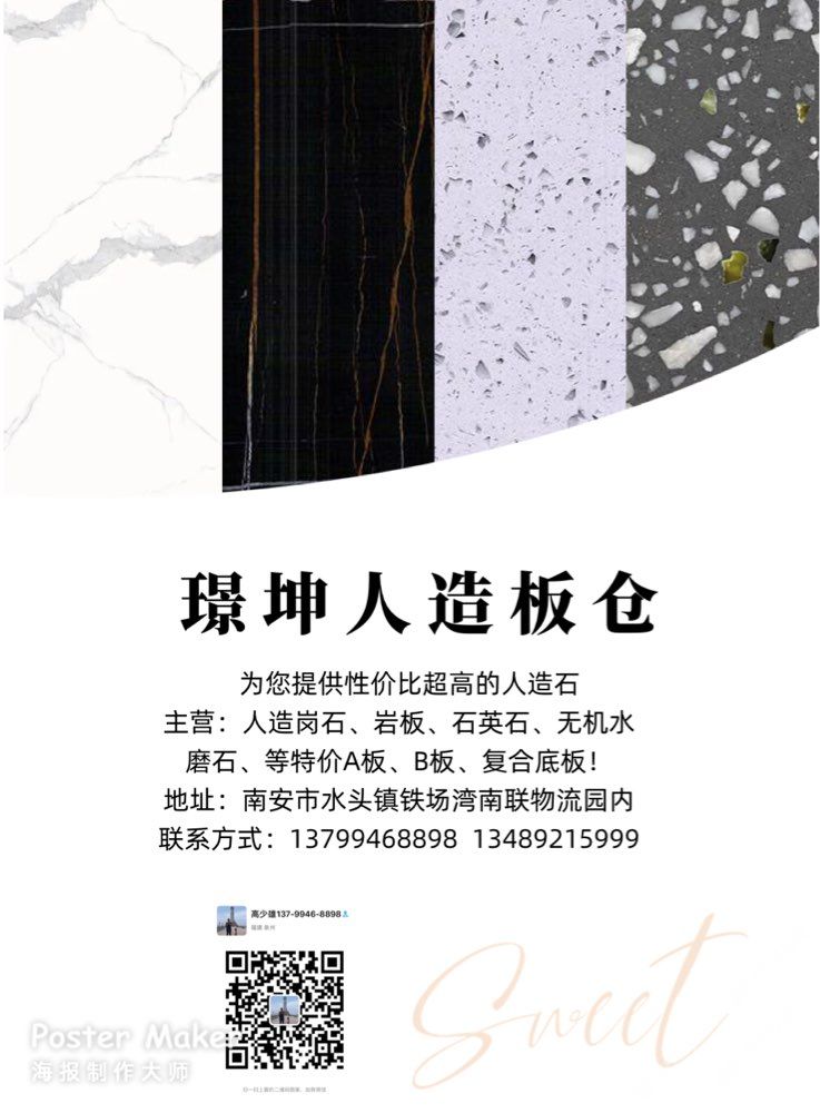 發(fā)布信息: ~璟坤人造板倉~特價人造石 主營:人造崗石、石英石、巖板、無機水磨石 現(xiàn)推出特價優(yōu)惠的人造板 特價A板、B板、復合底板專用 聯(lián)系電話:13799468898高先生 地址:南安市水頭鎮(zhèn)鐵場灣南聯(lián)停車場內(華置石業(yè)斜對面) #璟坤人造板倉# #璟坤石業(yè)專注:別墅,會所,酒店等室內外精裝石材#