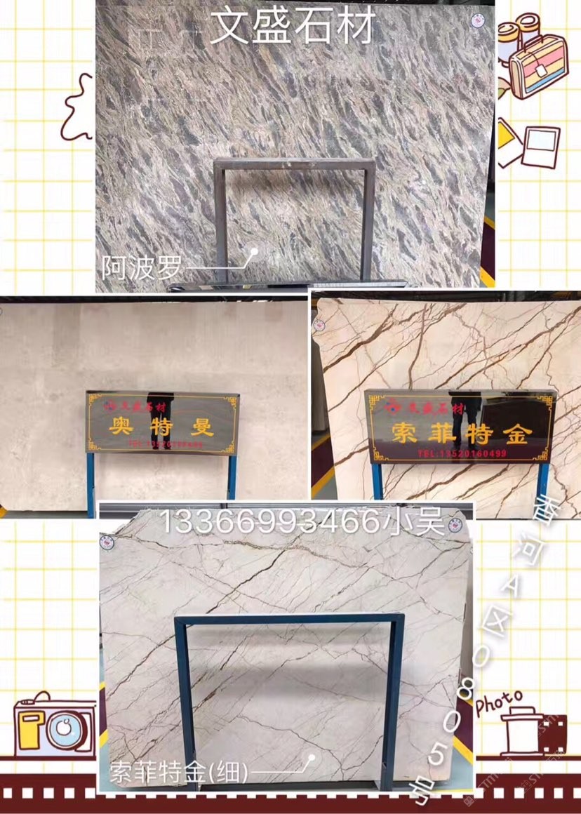 文盛石業(yè) 聯(lián)系人:柳女士    135****0499 查看 010****5796 查看 主營范圍: 異型加工、大板批發(fā)、荒料、石材雕刻、 企業(yè)地址:河北廊坊香河石材市場(chǎng)A區(qū)0805