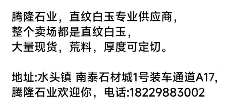 發(fā)布信息: 騰隆石業(yè),直紋白玉專業(yè)供應商, 整個賣場都是直紋白玉, 大量現(xiàn)貨,荒料,厚度可定切。 地址:水頭鎮(zhèn) 南泰石材城1號裝車通道A17, 騰隆石業(yè)歡迎你,電話:李13599988860 周18229883002