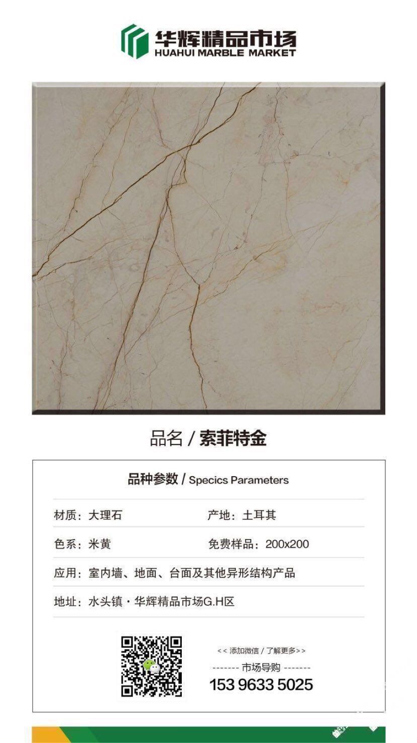 發(fā)布信息: 【華輝精品市場-昌福石業(yè)】 推薦:索菲特金 索菲特金源自于土耳其經(jīng)典石材,不規(guī)則的金黃色線條如行云流水般浮游于底色之上,打破了原有的平靜和單調(diào),淺黃的底色能更好的表現(xiàn)出天然大理石的風韻。?適用于酒店、工程等墻面地面的鋪貼。 導購電話:153 9633 5025