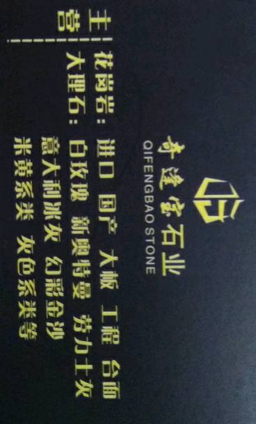 奇逢寶石業(yè)有限公司 聯(lián)系人:蔡美女    134****8588 查看 188****6766 查看 主營范圍: 大板批發(fā)、大理石加工、 企業(yè)地址:福建泉州南安市奎峰路華輝大板市場G07