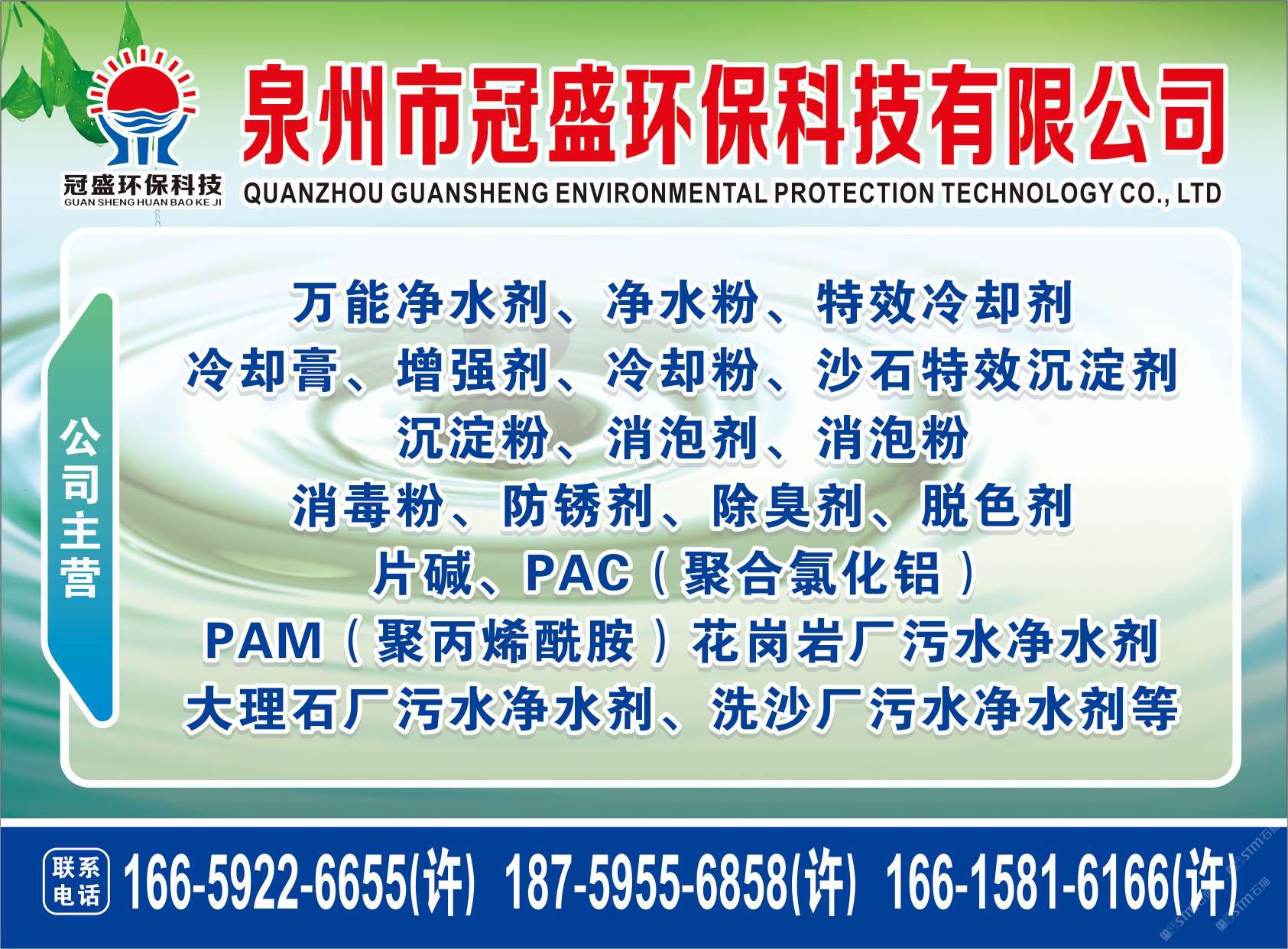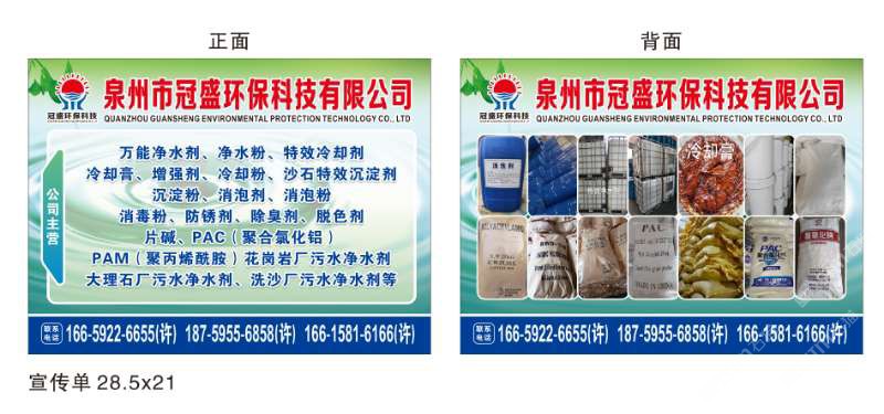 發(fā)布信息: 冠盛環(huán)??萍?8759556858 主營(yíng)產(chǎn)品:凈水劑,冷卻劑,冷卻粉,大理石人造石專用凈水劑,沉淀粉,消泡劑,消毒凈水劑,防銹凈水劑,除銹劑,除臭劑,聚丙烯酰胺,聚合氯化鋁,鹵精,洗沙專用凈水劑,壓濾機(jī)專用凈水劑,陶瓷廠專用凈水劑(黃藥 白藥)等所有水處理環(huán)保材料……