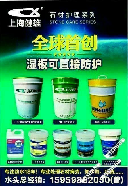 發(fā)布信息: 需要做防水的找我哦!主營:水性防水劑,油性防護(hù)劑(濕板直接防水,質(zhì)量超級好!),花崗巖除銹劑(超級好用,不會再反銹),大理石除黃劑,花崗巖增色增艷劑!水斑劑等等!咨詢電話??15959862050